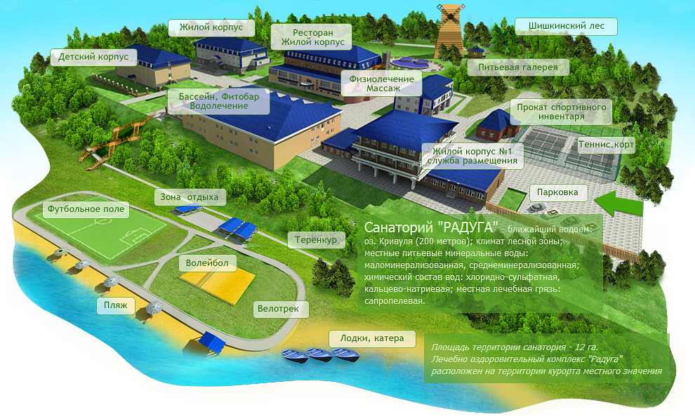 В «Лечебно-оздоровительном комплексе Радуга» к услугам Ваших детей: крытый бассейн и собственный оборудованный пляж (раздевалки, пляжные навесы, телефон, медицинские и спасательные посты), спортивный зал с тренажерами, футбольное поле, волейбольная площадка, теннисный корт, междугородный телефон, спортивные и развлекательные программы, трансфер.